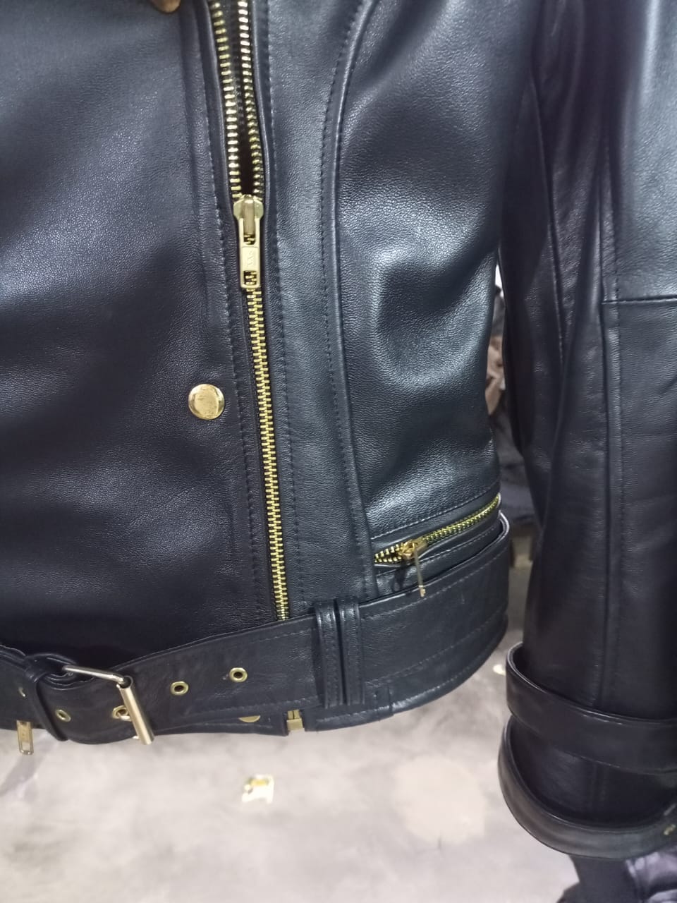 Rev up your style with our Exotic Look Black Perfecto leather jacket! This bold and daring biker jacket features a sleek black design, accented with golden zipper and snap buttons. Make a statement and embrace your inner risk-taker with this edgy addition to your wardrobe.
